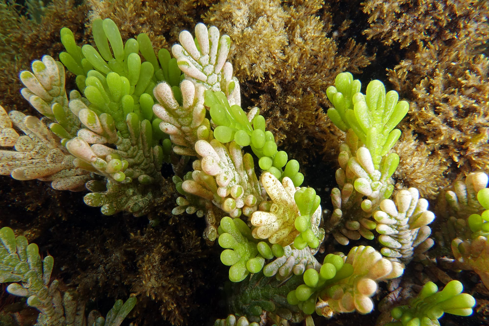Sea cactus (Caulerpa cactoides) is one of numerous species of the seaweed genus Caulerpa, which is found on all coasts but is most diverse in southern Australia. All species have one distinctive feature in common: a horizontal stem, called a ‘stolon’, that grows across the sea floor (the genus name is Greek for ‘creeping stem’). The upright fronds of Caulerpa come in a myriad of forms. In C. cactoides, they are thick and resemble a cactus, but in other species, they can be spiny or grape-like. The pale pink coating seen on this specimen from Cape Peron is a crustose coralline alga, which does not appear to negatively impact the Caulerpa.